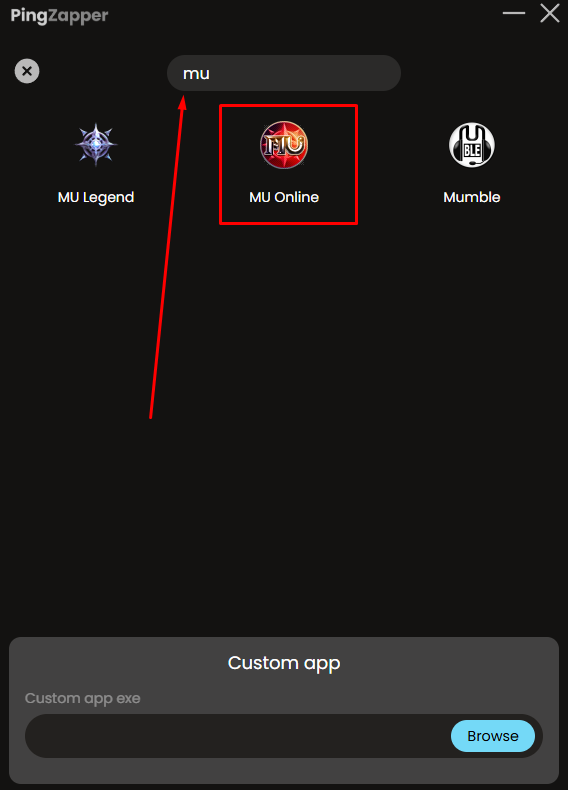 <p align="center"><strong>5. En la barra de busqueda escrobir "mu" y seleccionar Mu Online</strong></p>